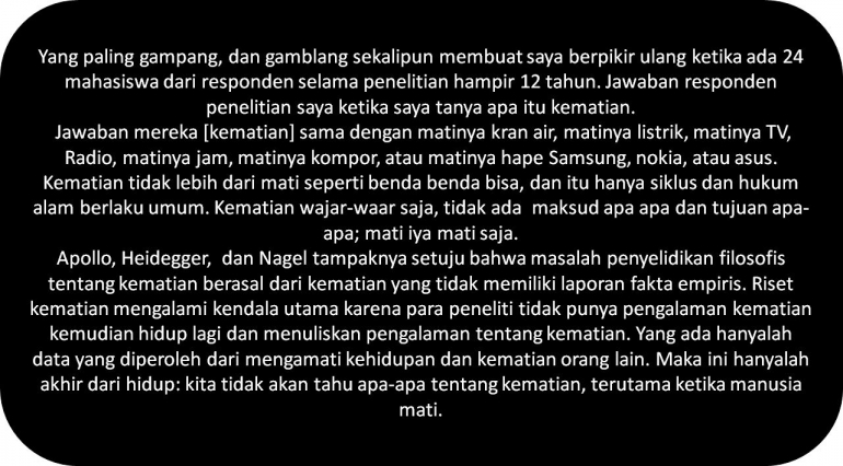 Riset ini membahas 3 tokoh tesebut secara berturut-turut Makalah ini membahas tiga pendekatan untuk konsep kematian. Secara pribadi saya melihat kematian sebagai tujuan hidup Sein zum Tod sebagaimana saya tafsirkan dari pemikiran Martin Heidegger. Jadi filsafat sebetulnya perpanjangan imtidad dari al-Quran sebagaimana fikih tafsir ushul fikih dan sebagainya.