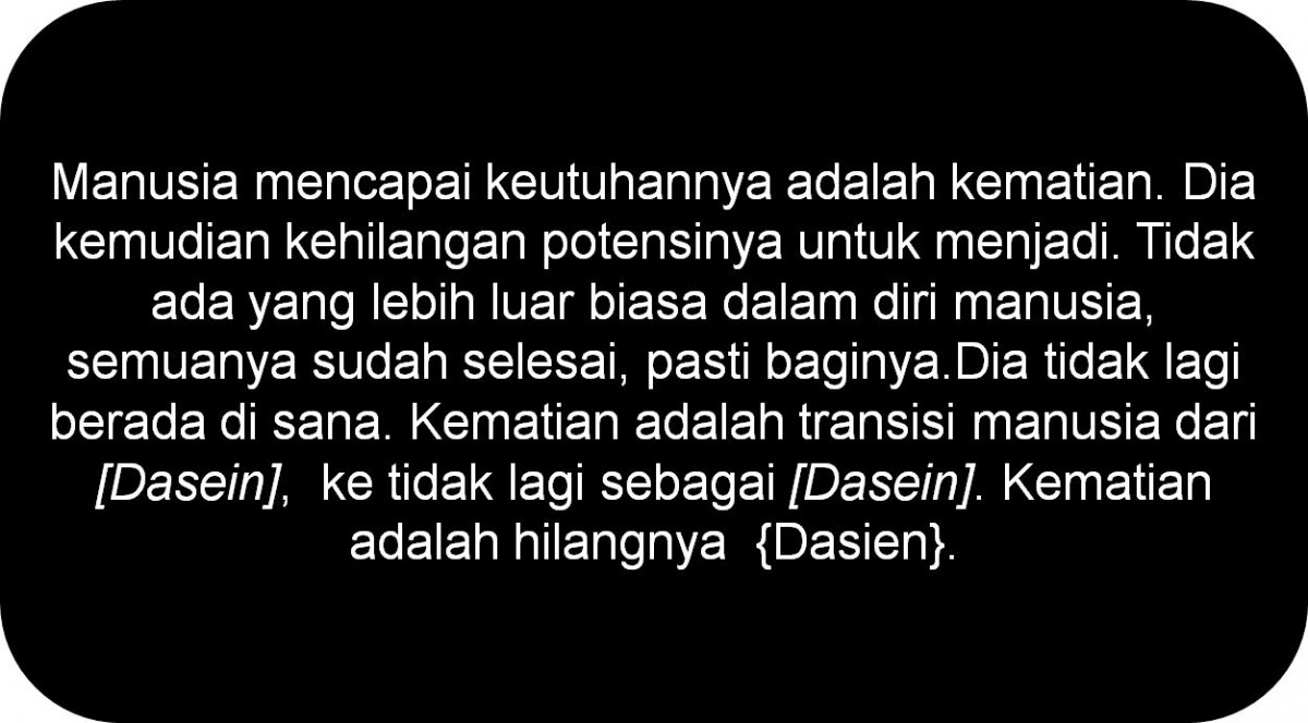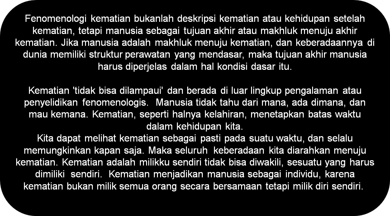 Ada namanya filsafat epikorus bikin poin waktu kita hidup kita tidak mati waktu kita mati tidak hidup. Budi Hardiman ECF 13 Oktober 2015 Renungan tentang kematian terletak di jantung Sein und Zeit. Para sufi mengartikan an-nafs sebagai sumber moral.